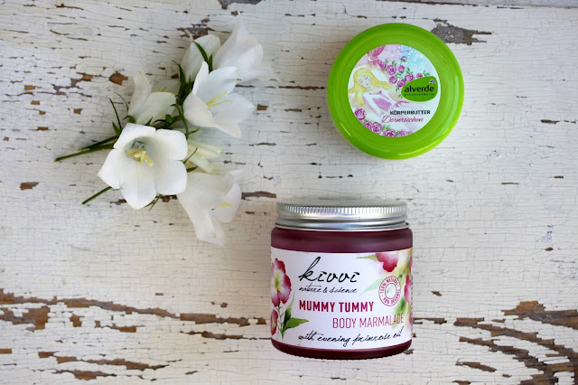 Kivvi Tělová marmeláda Mummy Tummy (120 ml). Když jsem byla v jiném stavu s Rózinkou, psala jsem o tomto těhotenském mazání recenzi. Pamatuji si, že byla určitě dost pozitivní. Zbytek marmelády, rozumějte super mastného másla, jsem spotřebovala až nyní, při třetím těhotenství a jsem ráda, že je sklenička konečně prázdná. Totiž, voní to hezky, vydrží to dlouho, promašťuje to kůži opravdu řádně, jenže mastné je všechno a máslo se dost pomalu vstřebává a stejně ne beze zbytku. Mě teď podobné mastné produkty moc nebaví, takže znovu na mazání břicha pořizovat nebudu (i když... jednu pomerančovou tu mám ještě načatou).